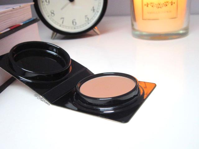 Dostępny jest w 3 wariantach: cieplejszej, chłodniejszej i z drobinkami. W dzisiejszej recenzji skupimy się na numerze 02 Cafe Creme. Z całej trójki ten jest najchłodniejszy, choć tak na prawdę można uznać go za neutralny. Jego uniwersalny kolor ma oliwkowe tony, dzięki czemu wygląda bardzo naturalnie. Można używać go zarówno do opalania jak i delikatnego konturowania. Jego konsystencja jest sucha, choć na twarzy daje aksamitne wykończenie. Łatwo się rozciera i nie robi plam. Jedyny minus to mocne pylenie. Lepiej nie szorować po nim pędzlem zbyt mocno.